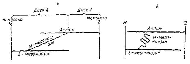 Рис. 11. Принципиальная схема, иллюстрирующая некоторые элементы гипотезы Дэвиса. а — фаза расслабления б — фаза сокращения
