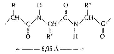 Меридианальные рефлексы позволяют считать период идентичности вдоль оси равным 6,95 Å, т. е. лишь немного меньшим 7,27 Å, предсказываемого теорией для идеальной ß-структуры Анализ инфракрасных спектров подтверждает правильность такого представления о вторичной структуре фиброина, свидетельствуя о перпендикулярном расположении С = О- и X—Н-связей к оси цепочки. Такая структура стабилизируется межцепочечными водородными связями.