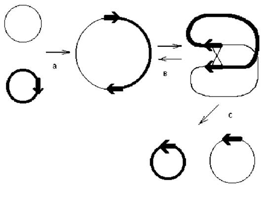 Рис. 2.10. Механизм репликативной транспозиции: а — образование коинтеграта; в — реципрокная рекомбинация между res-сайтами; с — Разделение коинтеграта. Стрелками обозначены транспозоны