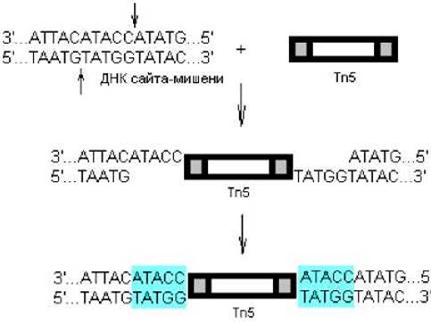 Рис. 2.11. Образование дуплицированных повторов в ДНК-мишени при транспозиции: стрелками обозначены сайты разрыва ковалентных связей в ДНК — результат воздействия на репликон-мишень транспозазы