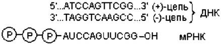 Когда РНК-полимераза связывается с промотором, происходит локальное расплетение двойной спирали ДНК и образуется открытый промоторный комплекс. В нем происходит копирование последовательности нуклеотидов смысловой, или (+)-цепи ДНК, имеющей направление 5'→3'. При этом синтез мРНК всегда начинается с нуклеотидов А или G. Вторая, антисмысловая цепь ДНК, служит матрицей для синтеза цепочки РНК (рис. 3.2).