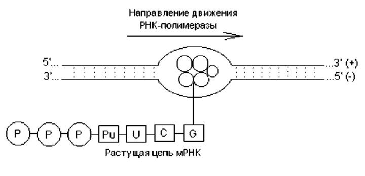 Рис. 3.3. Транскрипция ДНК: в локальном участке «расплетенной» ДНК работает кор-фермент, синтезируя цепь мРНК в направлении 5'Р → 3'ОН