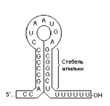 Рис. 3.4. Пример шпильки в составе мРНК, на которой заканчивается процесс транскрипции. В составе стебля шпильки присутствуют комплементарные нуклеотиды