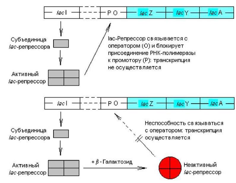 Когда клетки кишечной палочки выращиваются на среде с глюкозой в качестве единственного источника углерода, они содержат очень мало белков — продуктов структурных генов лактозного оперона: примерно по 10 молекул на клетку. В присутствии лактозы и других ß-галактозидов концентрация этих белков возрастает до 10 000 и более молекул на клетку. В этом случае лактоза (ß-галактозиды) служит индуктором синтеза названных ферментов, и это означает, что соответствующий оперон регулируется по типу индукции, т. е. кодируемые им ферменты синтезируются только в присутствии индуктора.