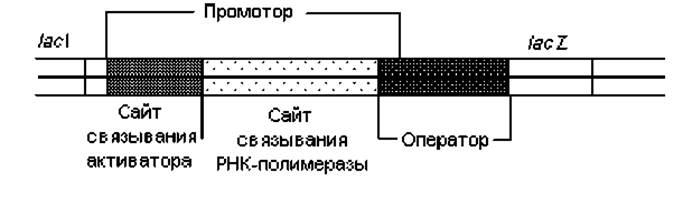 Рис. 3.7. Нуклеотидные последовательности, принимающие участие в регуляции экспрессии лактозного оперона