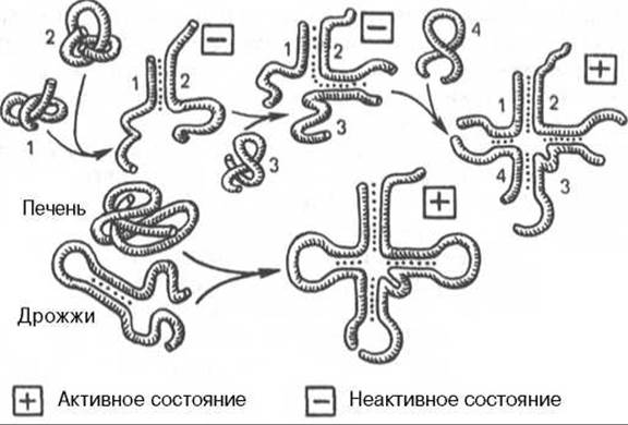 Все они оказались чувствительными к реагентам на SH-группы и требуют присутствия ионов Mg2+. Ферменты обладают абсолютной специфичностью действия, поскольку они узнают только одну какую-либо L-аминокислоту или одну тРНК. Для тех аминокислот, для которых открыты две и более тРНК (см. далее), соответствующая аминоацил-тРНК-синтетаза катализирует аминоацилирование всех этих тРНК. Это обстоятельство чрезвычайно важно, поскольку в дальнейшем в белковом синтезе «узнавание» аминоацил-тРНК основано не на природе Аминокислоты, а на химической природе антикодона тРНК. Считается, что в молекуле каждой аминоацил-тРНК-синтетазы имеется по крайней мере 3 центра связывания: для аминокислоты, тРНК и АТФ; ферменты весьма чувствительны также к аналогам аминокислот, которые ингибируют активирование соответствующих аминокислот. Некоторые ферменты состоят из одной полипептидной цепи, другие — из двух или четырех гомологичных или гетерогенных субъединиц.