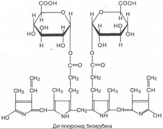 В печени билирубин соединяется (конъюгирует) с глюкуроновой кислотой. Эта реакция катализируется ферментом УДФ-глюкуронилтрансферазой, при этом глюкуроновая кислота вступает в реакцию в активной форме, т.е. в виде УДФГК. Образующийся глюкуронид билирубина получил название прямого билирубина (конъюгированный билирубин). Он растворим в воде и дает прямую реакцию с диазореактивом. Большая часть билирубина соединяется с двумя молекулами глюкуроновой кислоты, образуя диглюкуронид билирубина: