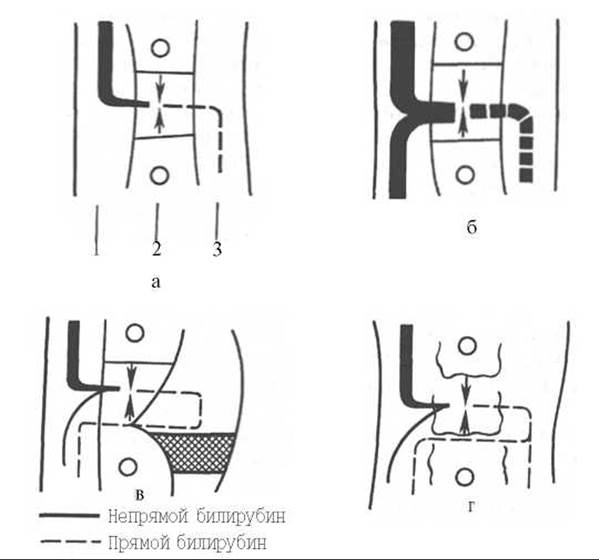 Рис. 16.5. Патогенез билирубинемий при различных патологических состояниях (схема).