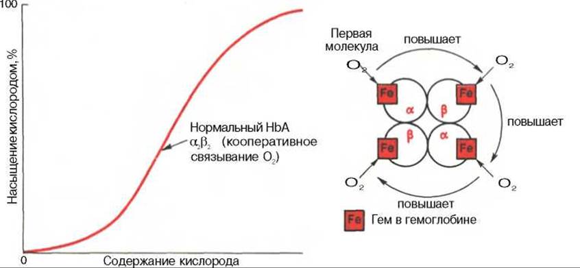 Характерная для гемоглобина S-образная кривая насыщения кислородом свидетельствует, что связывание первой молекулы кислорода одним из гемов гемоглобина облегчает связывание последующих молекул кислорода тремя другими оставшимися гемами. Долгое время механизм, лежащий в основе этого эффекта, оставался загадкой, так как, по данным рентгеноструктурного анализа, 4 гема в молекуле гемоглобина довольно далеко отстоят друг от друга и вряд ли могут оказывать взаимное влияние. В последнее время принято следующее объяснение происхождения S-образной кривой. Считают, что тетрамерная молекула гемоглобина способна обратимо распадаться на две половинки, каждая из которых содержит одну a-цепь и одну ß-цепь: