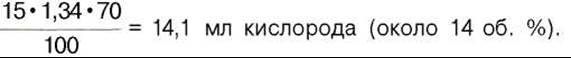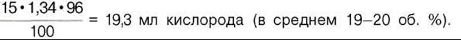 а каждый грамм гемоглобина — 1,34 мл кислорода. Содержание гемоглобина в крови здорового человека составляет 13—16%, т.е. в 100 мл крови 13—16 г гемоглобина. При РО2 в артериальной крови 107—120 гПа гемоглобин насыщен кислородом на 96%. Следовательно, в этих условиях 100 мл крови содержит 19—20 об. % кислорода: