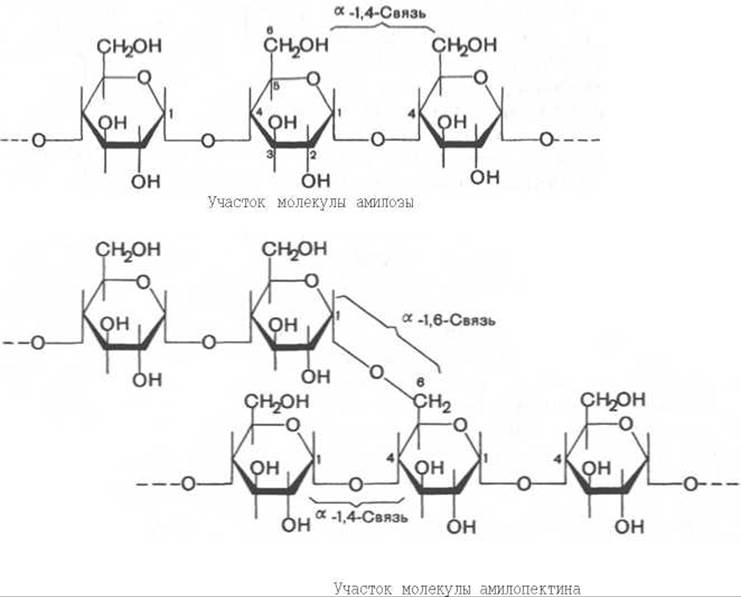 Крахмал представляет собой смесь 2 гомополисахаридов: линейного — амилозы и разветвленного — амилопектина, общая формула которых (С6Н10О5)n. Как правило, содержание амилозы в крахмале составляет 10—30%, амилопектина — 70—90%. Полисахариды крахмала построены из остатков D-глюкозы, соединенных в амилозе и линейных цепях амилопектина а-1→4-связями, а в точках ветвления амилопектина — межцепочечными а-1→6-связями: