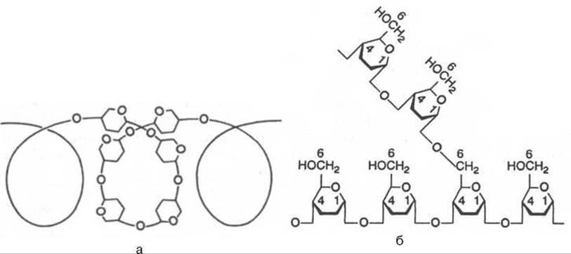 а - амилоза с характерной для нее спиральной структурой; б - амилопектин, образующий в точках ветвления связи типа 1-6.