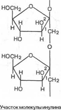 Степень полимеризации инулина равна примерно 35 моносахарным остаткам. Этот полисахарид в отличие от картофельного крахмала легко растворяется в теплой воде. Инулин используют в физиологических исследованиях для определения скорости клубочковой фильтрации в почках.