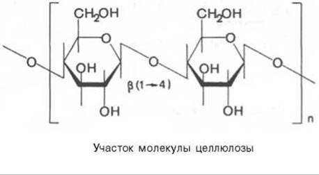 Целлюлоза (клетчатка) — наиболее широко распространенный структурный полисахарид растительного мира. Он состоит из а-глюкозных остатков в их ß-пиранозной форме, т.е. в молекуле целлюлозы ß-глюкопиранозные мономерные единицы линейно соединены между собой ß-(1→4)-связями: