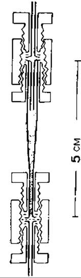 РИС. 12.4. Колонка для анализа пептидов на микро- уровне. Материал колонки — тефлоновая трубка, внутренний объем которой зависит от количества используемого носителя. В верхнюю часть колонки введена узкая тефлоновая трубка, нижний конец колонки закрыт пористым тефлоновым фильтром с диаметром пор 2 мкм (фирма Zitex, Chemplast Inc.). Колонка помещена в термостатированную стеклянную трубку (см. рис. 12.1) [52, 69].