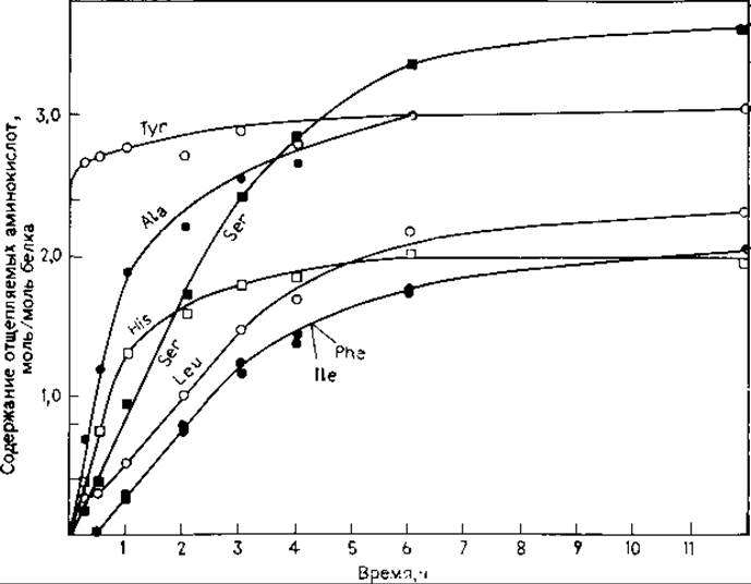 Анализ данных, представленных на рис. 18.13, позволяет вывести следующую последовательность первых четырех аминокислот: Ser-His-Ala-Tyr. Предполагалось [95], что пятым остатком является Leu, за ним следуют, согласно измерению скорости высвобождения, Ilе и Phe. Эти аминокислоты отщеплялись в одинаковых количествах, но можно предположить указанную последовательность их расположения в цепи, так как известно, что карбоксипептидаза А отщепляет Phe в 26 раз быстрее, чем Не. Размещение Leu в пятом положении представляется неправомерным, так как скорость его отщепления приблизительно равна скорости высвобождения Ilе и Phe, превышая последние по абсолютному значению лишь на 0,25 моля для каждой точки определения.