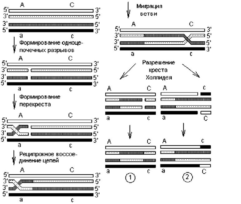 Г омологичная рекомбинация начинается с надрезания однонаправленных цепей в гомологичных молекулах ДНК, после чего свободные концы одной цепи спариваются со свободными концами другой цепочки, и формируется структура Холлидея (по имени исследователя впервые предложившего ее). Точка перекреста обменивающихся цепей перемещается вдоль рекомбинирующих молекул — миграция ветви (креста). При этом происходит размыкание водородных связей между комплементарными нуклеотидами внутри одной родительской молекулы ДНК и замыкание соответствующих связей между нуклеотидами цепей, принадлежащих разным молекулам ДНК. Структуры Холлидея затем переходят в рекомбинантные Двойные спирали (разрешаются) путем внесения разрывов и воссоединения цепей двумя альтернативными способами. В первом способе разрезаются и воссоединяются перекрещивающиеся однонаправленные цепи, а в другом — неперекрещивающиеся однонаправленные цепочки. При миграции креста Холлидея осуществляется спаривание цепей, принадлежащих разным молекулам ДНК, т. е. образуются гетеродуплексы. В их составе могут содержаться некомплементарные нуклеотиды, которые удаляются так же, как при репарации ДНК, а шаблоном в данном случае может служить любая из цепей.