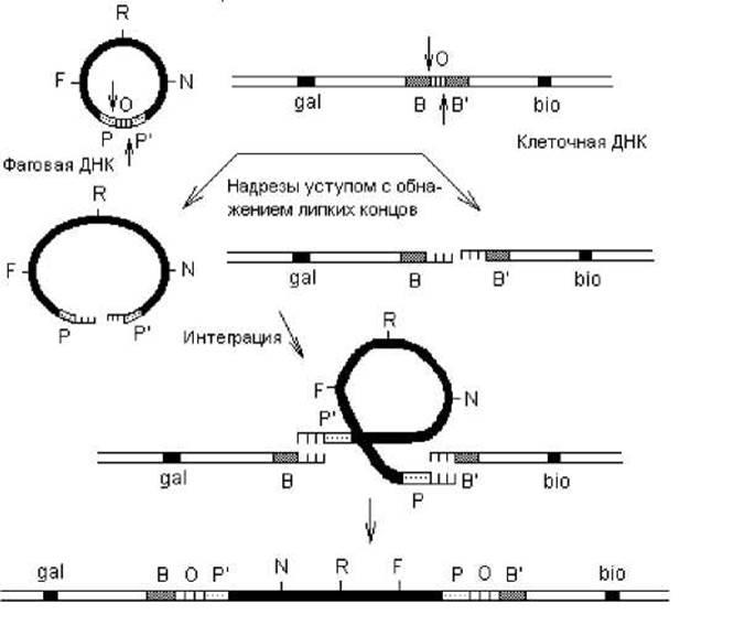 Рис. 2.8. Интеграция ДНК фага λ в хромосому E. coli