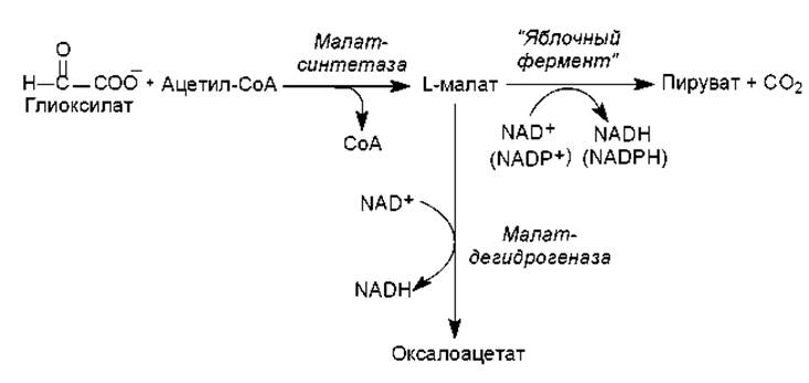 Глиоксилат затем конденсируется с еще одной молекулой ацетил-СоА (фермент малат-синтетаза) и превращается в L-малат. Это четырехуглеродное соединение может окисляться в оксалоацетат либо декарбоксилироваться с образованием пирувата. И оксалоацетат, и Пируват могут использоваться клеткой в качестве предшественников биосинтеза многих нужных клетке веществ, в том числе глюкозы (рис. 11.7).