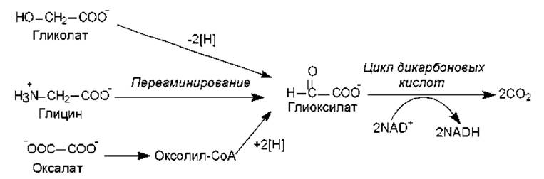 Некоторые бактерии существуют в условиях, когда единственным источником углерода являются такие двухуглеродные соединения, как гликолат, Глицин, оксалат. Все эти вещества могут превращаться в глиоксилат (рис. 11.8), который, в свою очередь, окисляется до СО2 и Н2О в цикле дикарбоновых кислот. В этом цикле акцептором глиоксилата служит ацетил-СоА, который регенерируется в системе реакций. Каждый оборот цикла сопровождается образованием двух молекул углекислоты и высвобождением двух пар электронов, которые в составе двух молекул NADH поступают в дыхательную цепь.