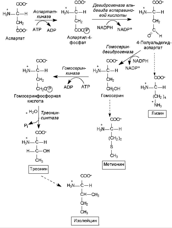 Рис. 16.7. Биосинтез треонина. Схема путей биосинтеза метионина, лизина, изолейцина (пунктирные стрелки)
