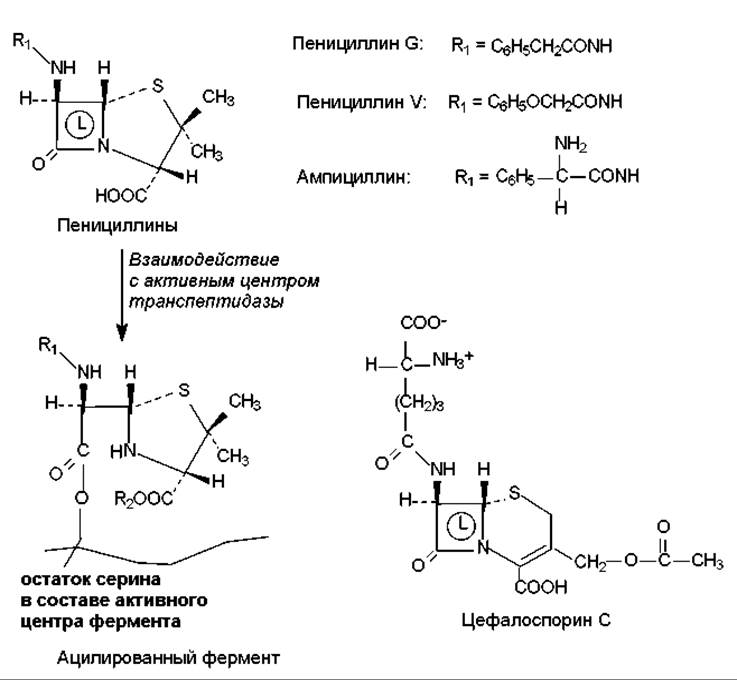 Ингибиторы синтеза клеточной стенки. Таким действием обладают ß-лактамные Антибиотики, к числу которых относятся пенициллины, цефалоспорины, нокардицин А, сульфазецин, тиенамицин и др. Все перечисленные соединения имеют в своем составе ß-лактамное кольцо (рис. 18.1). Мишенью этих антибиотиков является бактериальный фермент гликопептидтранспептидаза, который катализирует формирование поперечных сшивок в молекуле муреина. ß-Лактамные антибиотики имеют структурное сходство с фрагментом субстрата этого фермента (-D-Аla-D-Аla-OH) и связываются в активном центре транспептидазы таким образом, что ß-лактамное кольцо оказывается в непосредственной близости от остатка серина. Гидроксильная группа серина участвует в формировании устойчивой ковалентной связи с атомом углерода нестабильного ß- лактамного кольца (рис. 18.1). В результате образуется неактивная ацилированная форма транспептидазы, которая не способна катализировать реакцию транспептидирования (глава 14). Такое ингибирование фермента является необратимым, а действие антибиотиков носит бактерицидный характер: дефектная клеточная стенка не обладает должным запасом прочности и при увеличении Клетки в процессе роста или осмотического поступления в нее воды разрушается.