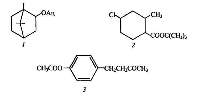 1 — D-борнилацетат; 2 — тримедлур; 3 — куелур; Ац — ацетил