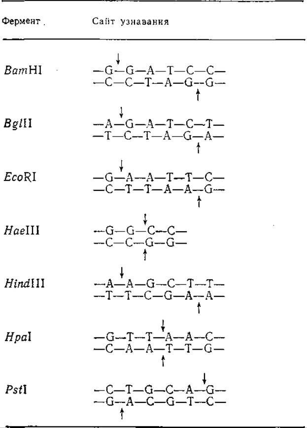 Таблица 6.7. Некоторые рестрикционные эндонуклеазы, соответствующие сайты узнавания и расщепляемые связи (указаны стрелками)
