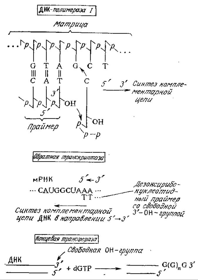 РИС. 6.22. Характерные реакции некоторых синтезирующих ферментов, используемых при получении рекомбинантных ДНК.