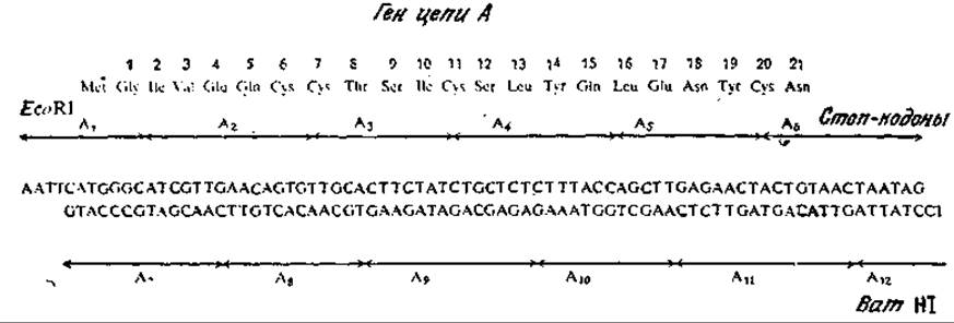 РИС. 6.25. Ген, отвечающий цепи А инсулина человека (аминокислотная последовательность приведена в верхней части рисунка). Этот ген был синтезирован из 12 олигодезоксирибонуклеотидов A1—А12. [Воспроизведено из статьи: Crea R., Kraszewski A., Hirose Т., Iiakura К., Chemical Synthesis of Genes for Human Insulin, Proc. Natl. Acad. Sсi. (USA), 75, 5765 (1978).]