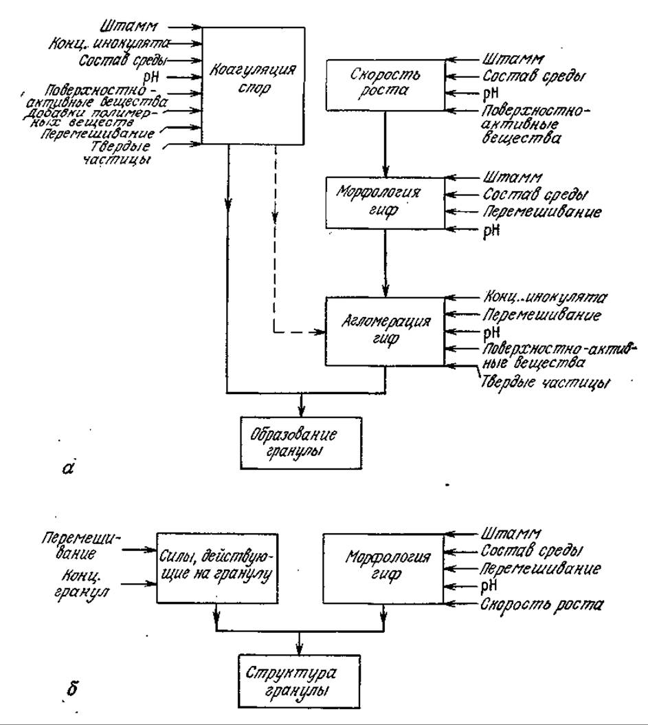 РИС. 7.21. Факторы, определяющие образование гранулы (а) и ее структуру (б) в процессе роста мицеллярных организмов. [Воспроизведено с разрешения из статьи: Metz В., Kossen N. W. F., Biotechnology Review: The Growth of Molds in the Form of Pellets. — A Literature Review, Biotech. Bioeng., 19, 781 (1977).]