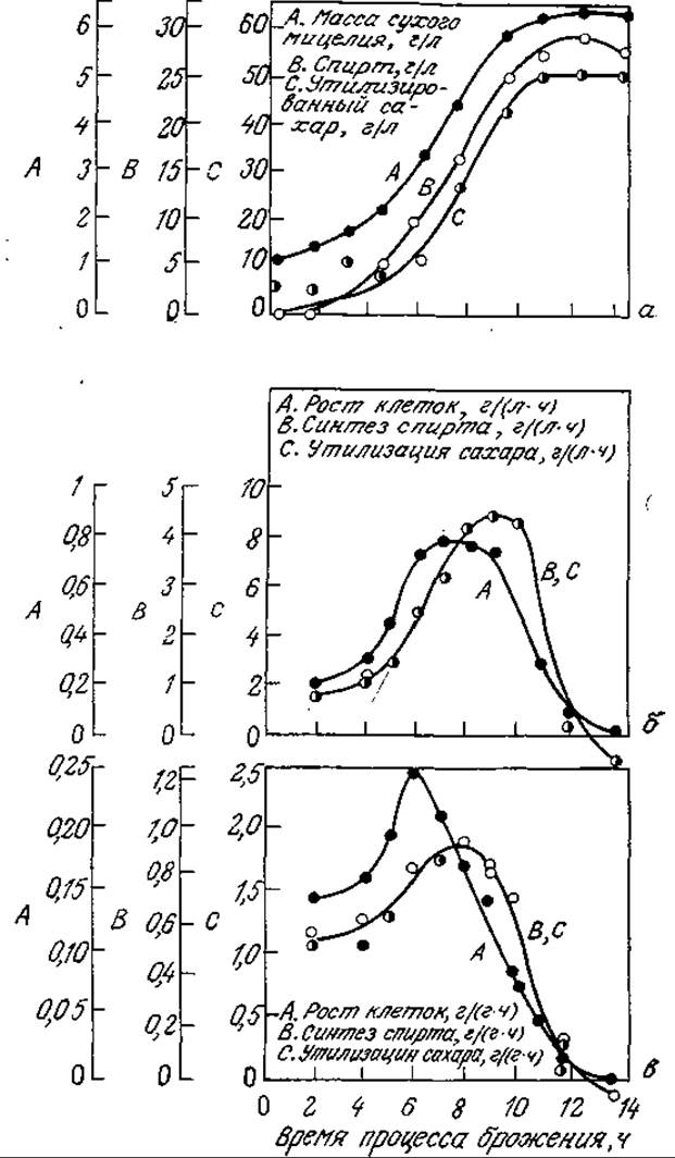 РИС. 7.29. Для процесса спиртового брожения характерна простая сопряженная с клеточным ростом кинетика образования продукта метаболизма. На рисунке указано изменение во времени биомассы, массы образовавшегося спирта и утилизированного сахара (а); объемных и удельных скоростей образования биомассы, утилизации субстрата и синтеза продукта метаболизма (спирта) (б, в). [Воспроизведено из работы: Leudeking R. Fermentation Process Kinetics, in Biochemical and Biological Engineering, Blakebrough N. (ed.), vol. 1, p. 203, Academic Press, Inc., (London) Ltd., London, 1967.]