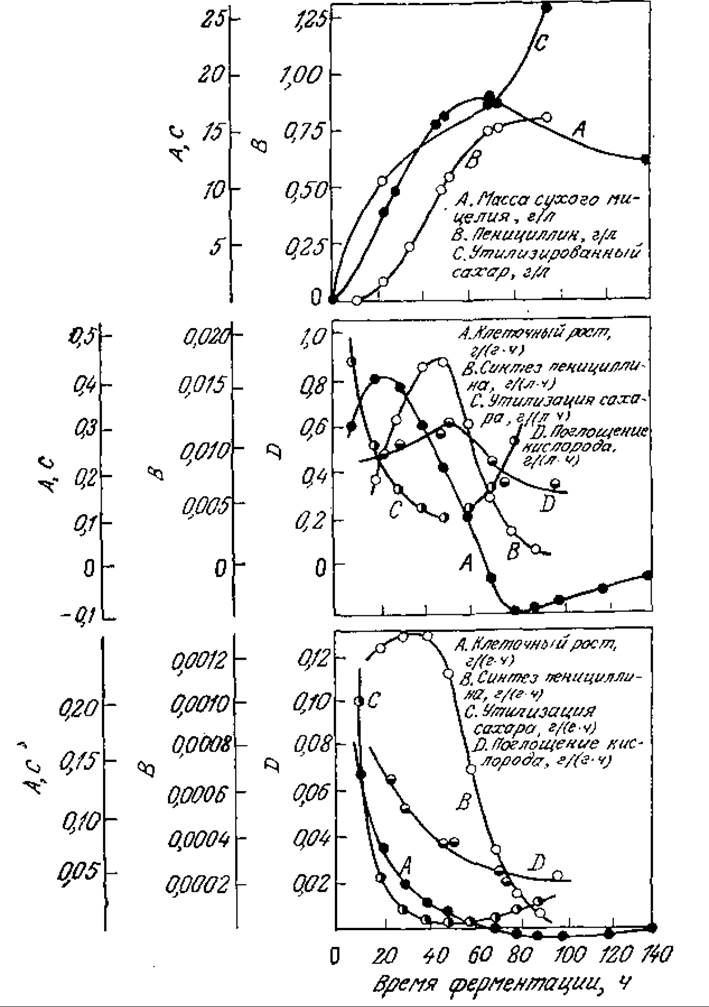 РИС. 7.30. Усложненная кинетика биосинтеза вторичного метаболита пенициллина. Указано изменение во времени биомассы, массы образовавшегося пенициллина и утилизированного сахара (а); объемных и удельных скоростей образования биомассы, синтеза пенициллина, утилизации сахара и кислорода (б, в). [Воспроизведено из работы: Leudeking R., Fermentation Process Kinetics, in Biochemical and Biological Engineering, Blakebrough N. (ed.), vol. I, p. 205, Academic Press, Inc., (London) Ltd., London, 1967.]