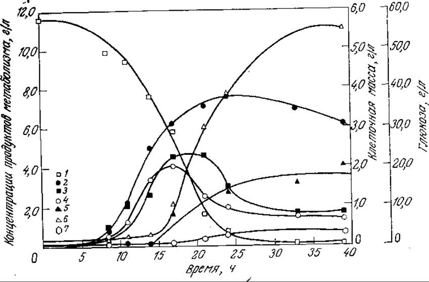 Рис. 7.31. Образование различных веществ в ходе периодического роста Cl. acetobulylicum при pH 5; приведены экспериментально найденные концентрации глюкозы (1), клеточной массы (2), уксусной кислоты (3), масляной кислоты (4), ацетона (5), бутанола (6), этанола (7). [Воспроизведено с разрешения из статьи: Costa J. М., Moreira A. R., Growth Inhibition Kinetics for the Acetone-Butanol Fermentation, ACS Symposium Series, 207, 501 (1983).]