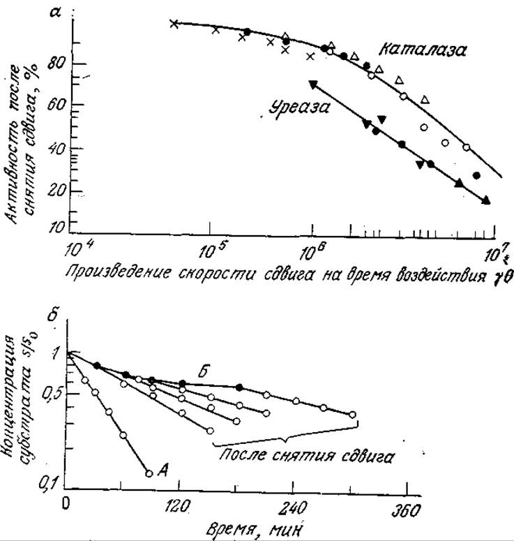 РИС. 3.30. а — инактивация каталазы и уреазы под воздействием сдвига (здесь различными символами обозначены разные скорости сдвига), б — конверсия мочевины раствором уреазы в состоянии покоя (А), под воздействием сдвига (скорость сдвига 1717 см-1) (5) и через разные периоды времени после снятия сдвига (0,4 единицы уреазы в 1 мл раствора, pH 6,75, 23 °С), [Результаты изучения каталазы воспроизведены с разрешения из статьи: Charm S. Е., Wong В. L., Enzyme Inactivation with Shearing, Biotech. Bioeng., 12, 1103 (1970). Данные по изучению уреазы воспроизведены из работы: Tirrell М., Middleman S., Shear Modification of Enzyme Kinetics, Biotech. Bioeng., 17, 299 (1975).]