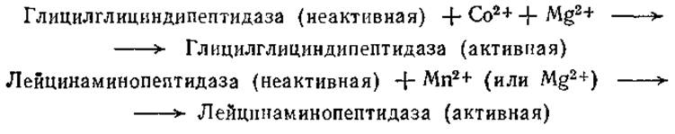РИС. 4.4. Активация протеолитических ферментов, а — образование активных ферментов из предшественников; б — образование активных ферментов в присутствии ионов металлов.