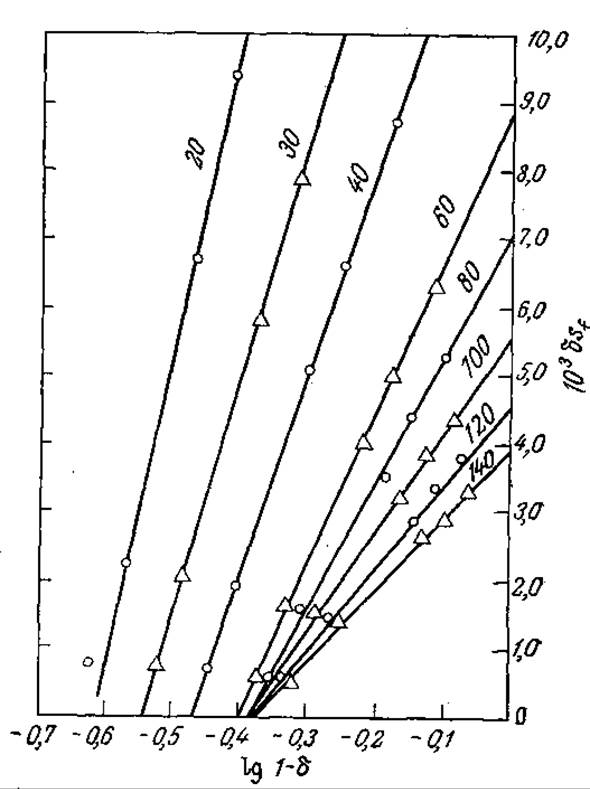РИС. 4.17. Экспериментальное обнаружение взаимосвязи между скоростью трансформации субстрата δ [δ = (sf - se)/sf, где sf и se — концентрации субстрата в исходной смеси и в продуктах реакции соответственно] и скоростью потока [указана цифрами на кривых (мл/ч)] в реакторе со слоем иммобилизованного фермента (изучалась реакция гидролиза этилового эфира бензоил-L-аргинина фицином на карбоксиметилцеллюлозе). Если бы кинетика процесса подчинялась уравнению Михаэлиса — Ментен, то при потоке идеального вытеснения наклон всех кривых был бы одинаков и равен Кm. Изменение наклона с изменением скорости потока свидетельствует о значительном влиянии массопередачи на кинетику процесса в целом. [Воспроизведено с разрешения из статьи: Lilly М. D., Hornby W. Е., Crook Е. М., The Kinetics of Carboxymethylcellulose — Ficin in Packed Beds, Biochem. J., 100, 718 (1966).]