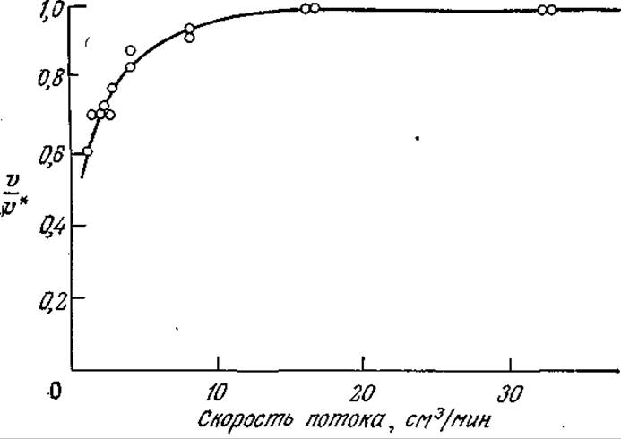 РИС. 4.18. Экспериментальный метод обнаружения эффектов внешней диффузии; здесь v* — скорость реакции при высоких скоростях потока через насадочную колонну (изучалась реакция гидролиза 4∙10-4 М раствора n-нитроанилида N-бeнзил-DL-аргинина иммобилизованным трипсином при pH 8 и 25 °С). [Воспроизведено с разрешения из работы: Ford J. R. et al, Recirculation Reactor System for Kinetic Studies of Immobilized Enzymes, in Enzyme Engineering, Wingard L. B., Jr. (ed.), Wiley-Interscience, New York, 1972.]