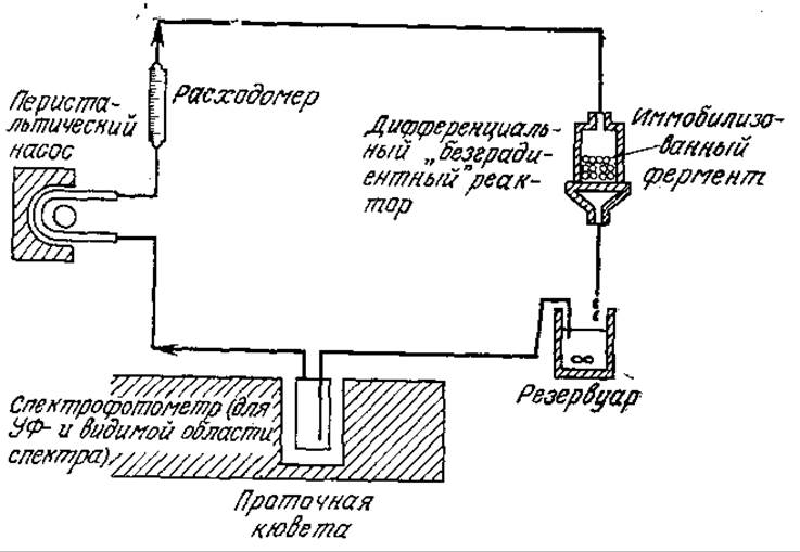 РИС. 4.19. Реактор с рециркуляцией для изучения влияния внешней массопередачи на кинетику реакций, катализируемых иммобилизованными ферментами.