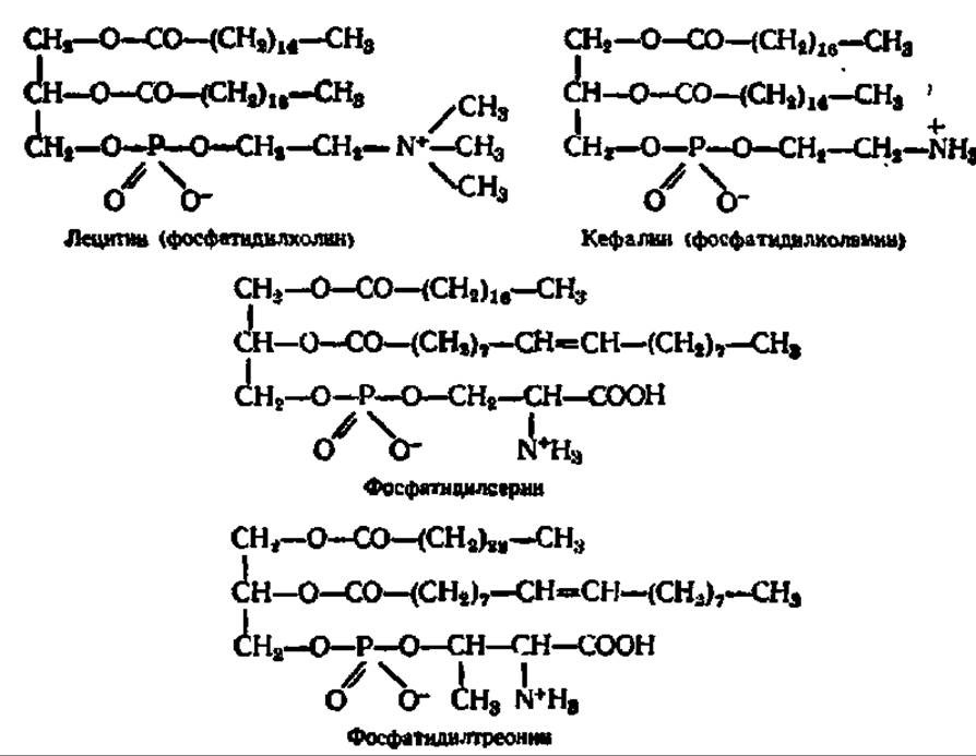 В зависимости от характера азотистого основания среди фосфатидов различают фосфатидилхолин (лецитины), фосфатидилколамин (кефалины), фосфатидилсерин и фосфатидилтреонин:
