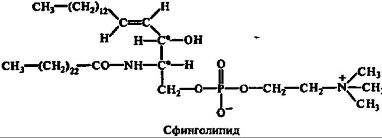 Сфинголипидам свойственны весьма сложные пространственные конфигурации, связанные с возможностью оптической изомерии (два асимметричных углеродных атома в молекуле) и цис-транс-изомерии по месту двойной связи. Этим объясняется их органная и видовая Специфичность. Кроме того, установлено, что органная специфичность сфинголипидов зависит от качественного состава высших жирных кислот: так, для сфинголипидов мозга характерно присутствие нервоновой кислоты.