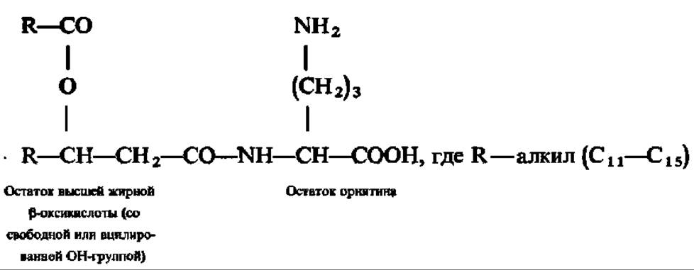 Орнитинолипиды. Первые указания о существовании этого нового вида липидов относятся к 1963 г. В течение двух последующих десятилетий структура многих из них была расшифрована и высказаны предложения об их функциональной роли.
