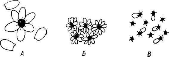 А — образование комплекса антиген—антитело между поливалентным антигеном и одновалентным антителом (антитело взято в избытке); Б — образование преципитатов при неспецифической агрегации комплексов антиген-антитело; В — растворимый комплекс при избытке антигена.