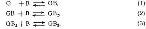 Были сделаны попытки вскрыть сущность реакции между антигеном и антителом, применяя закон действующих масс [108]. Главная трудность, с которой столкнулись при этих попытках, заключается в том, что реакция между антигеном и антителом обратима только частично. Некоторые преципитаты не растворяются в избытке антигена, хотя такой избыток и тормозит само образование преципитата [109]. Если обозначить молекулу антигена через G, а молекулу антитела через В, то реакцию между антигеном и антителом можно представить в следующем виде [83]: