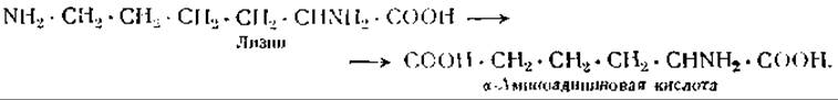 Эти особенности обмена лизина зависят от того, что его ε-аминогруппа менее стабильна, чем а-аминогруппа, и что лизин в печени быстро превращается в а-аминоадипиновую кислоту [118]: