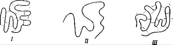 Первая достаточно обоснованная теория денатурации была выдвинута By [134]. Согласно этой теории, денатурация возникает вследствие разрыва денатурирующим агентом слабых связей, удерживающих пептидные цепи вместе, — разрыва, который сопровождается соответствующим изменением в расположении этих цепей. Если сочетать эту концепцию By с изложенными выше данными относительно строения глобулярных белков, то можно сказать, что при денатурации белка происходит изменение его специфической внутренней структуры, причем сложенные в складки пептидные цепи развертываются. В зависимости от особенностей действия денатурирующего агента, ставшие свободными пептидные цепи могут остаться развернутыми (фиг. 29,11), могут вновь сложиться в складки с образованием прежней специфической структуры (фиг. 29,1) или же, наконец, образовать новую структуру (фиг. 29,ІІІ), отличную от прежней.