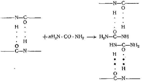 Денатурирующее действие концентрированных растворов мочевины объясняется, вероятно, образованием водородных связей с пептидными группировками. Возможно, что небольшие полярные молекулы мочевины при своем тепловом движении вдвигаются, как клинья, между пептидными цепями, разрывая имеющиеся водородные мостики и образуя новые с освободившимися группами. Это может быть показано следующими формулами, в которых длинные горизонтальные линии обозначают две параллельные пептидные цепи: