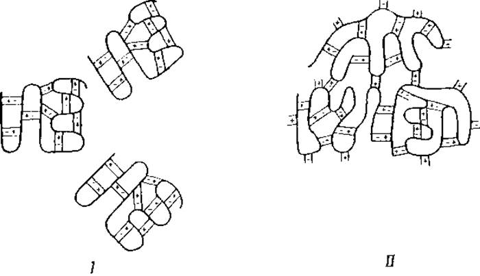 На фиг. 30 схема І изображает молекулу нативного белка, имеющую только внутримолекулярные солевые мостики, схема II представляет молекулы денатурированных белков, соединенные друг с другом межмолекулярными солевыми мостиками. На этих схемах образование структур, протекающее фактически в трех измерениях, представлено на плоскости, т. е. в двух измерениях. Гипотеза, приписывающая свертывание белков образованию солевых мостиков между ионными группами белков, принимается, однако, далеко не всеми исследователями. Некоторые из них считают, что нерастворимость денатурированных белков связана с пространственным перераспределением полярных и неполярных групп, которое выражается в переносе неполярных, гидрофобных групп на поверхность молекулы1 [134, 175, 176].