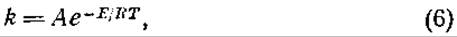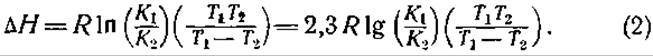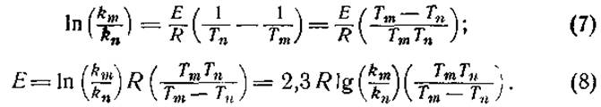 где k — постоянная скорости, А — постоянная, е — основание натуральных логарифмов, Е — энергия активации, R — газовая постоянная (1,98 кал) и Т — абсолютная температура. Определяя постоянные скорости km и kn при двух температурах Тm и Тn, можно исключить член А: