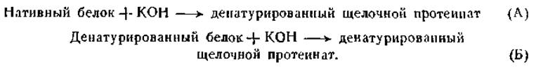 Скорость денатурации одних и тех же белков, выделенных из крови различных видов животных, может резко различаться. Это было показано на примере денатурации гемоглобинов разных видов животных едким натром. Так, например, Гемоглобин человека денатурируется на 50% 0,05 н. раствором едкого натра в течение 20—30 сек., между тем денатурация на 50% гемоглобина быка происходит лишь в течение нескольких часов [180]. Интересно отметить, что скорость денатурации обоих гемоглобинов при нагревании или при действии соляной кислоты одинакова [181]. Эти данные могут быть объяснены тем, что разные денатурирующие агенты действуют на различные группировки белков, образуя отличающиеся друг от друга конечные продукты [182].